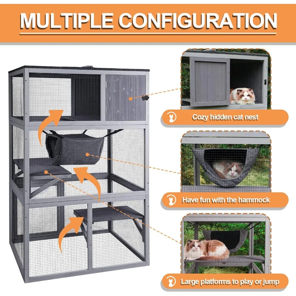 PET Catio Wooden Cat House, Outdoor 3 Floors Cat Enclosure, Indoor Large Kitten playpen with Hammock & Resting Box, Cat C